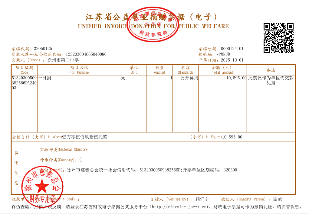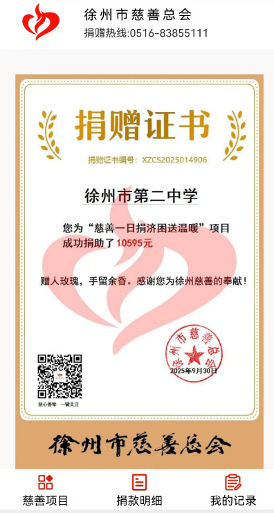 为贯彻落实习近平总书记关于民生工作和慈善事业重要讲话与指示精神,引导和激励人们乐善好施、崇德向善,我校工会依据相关文件工作要求,近期组织开展了2025年度“慈善一日捐”活动,教职员工共计捐款10595元。学校工会及时把募捐情况公示并将捐款全部上交徐州市慈善总会。