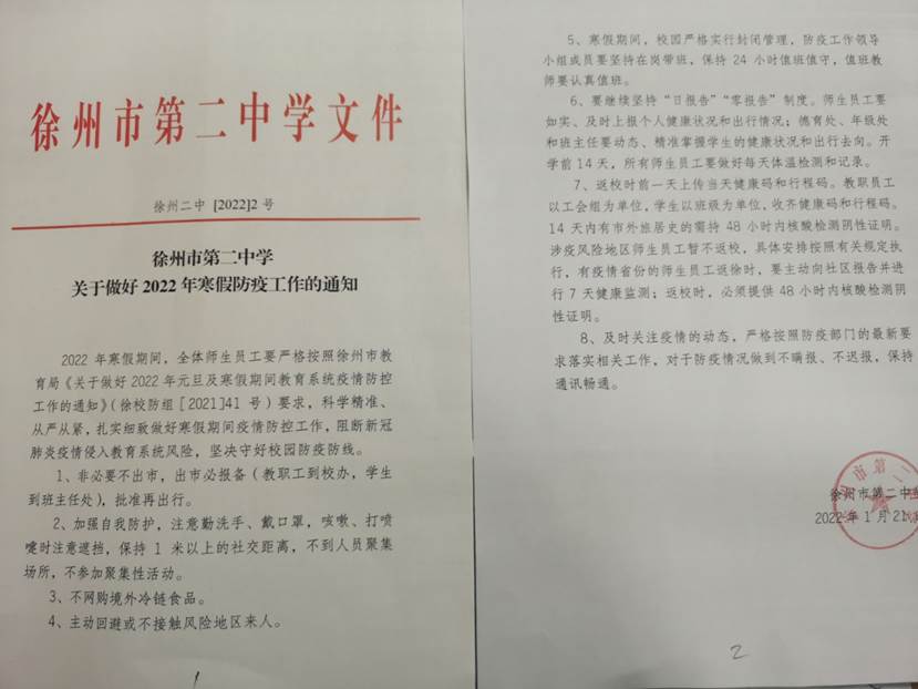 徐州市第二中学关于做好2020年寒假防疫工作的通知