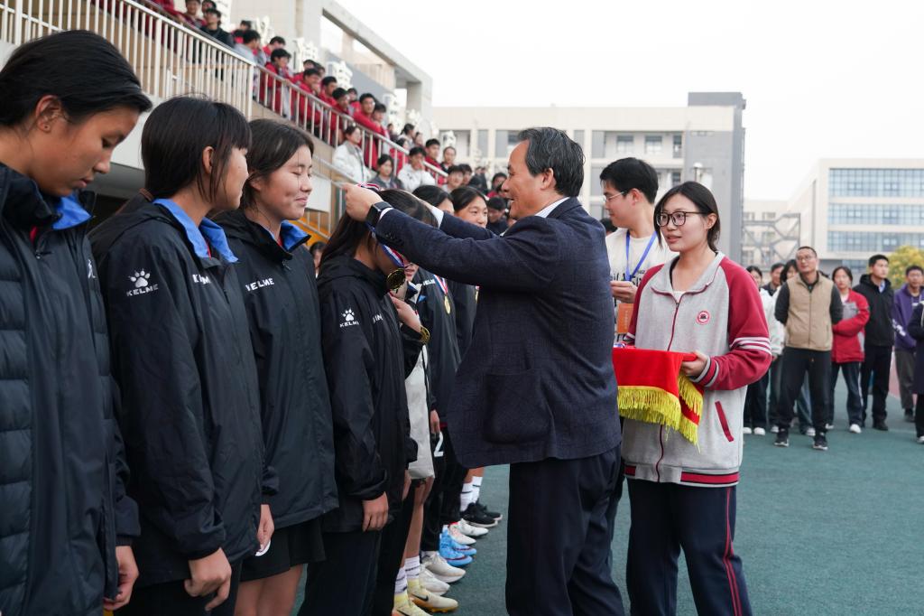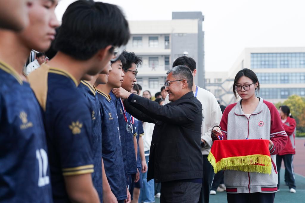 全部赛事结束后,隆重的颁奖典礼在雄壮的进行曲中拉开帷幕。经过综合评定,本届运动会团体总分桂冠由高一(1)班、高二(15)班、高三(13)班摘得,学校领导为他们及在各项比赛中取得优异成绩的个人颁发了奖状与奖牌。掌声与欢呼声响彻全场,这是属于集体的高光时刻,也是对所有参赛者辛勤付出的最好嘉奖。
