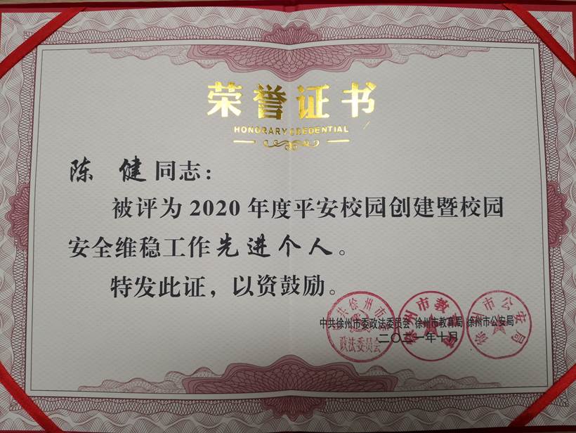 我校陈健同志被徐州市委政法委、徐州市教育局、徐州市公安局联合评为“2020年度平安校园创建暨安全维稳工作先进个人”,特向全校师生报喜!