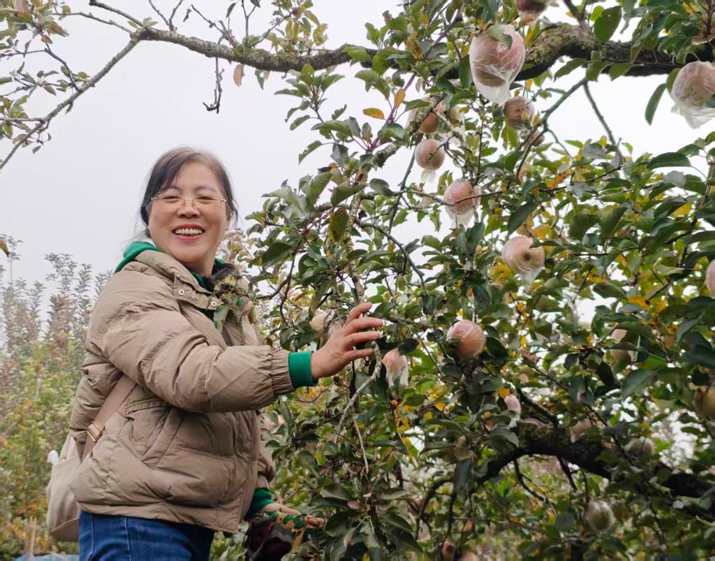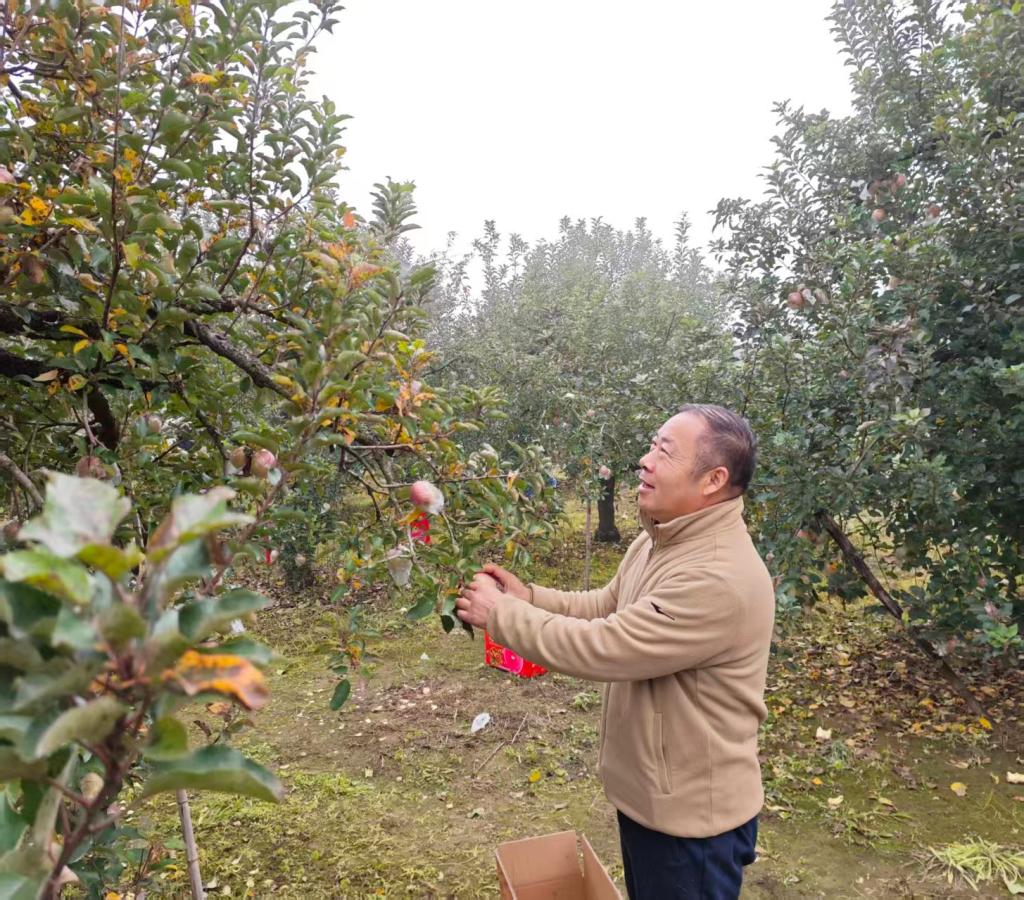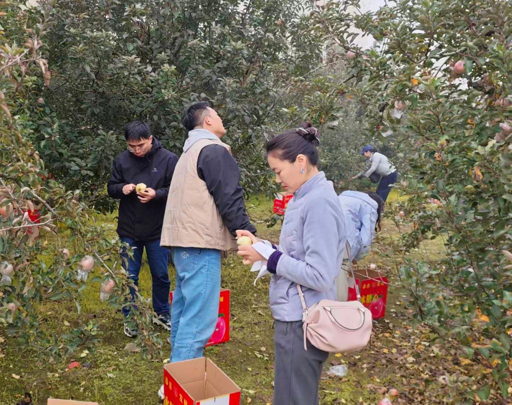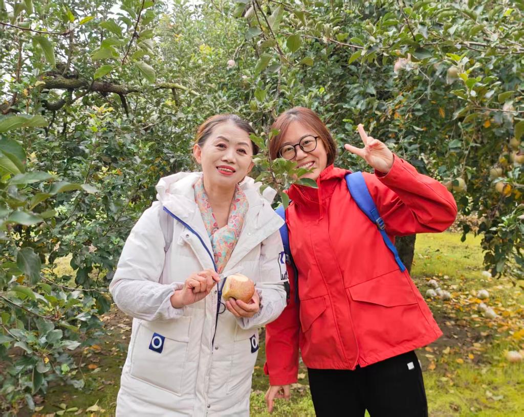 上午10时,大家抵达苹果园。成片的果树枝繁叶茂,红彤彤的苹果挂满枝头,果香四溢,令人垂涎。在果园工作人员的简单讲解后,大家迫不及待地拿起采摘箱,穿梭在果树间,或踮脚采摘高处的果实,或俯身挑选低处的鲜果,大家协作配合,互帮互助采摘高处苹果,温馨互动情景成为果园里一道动人的风景线。