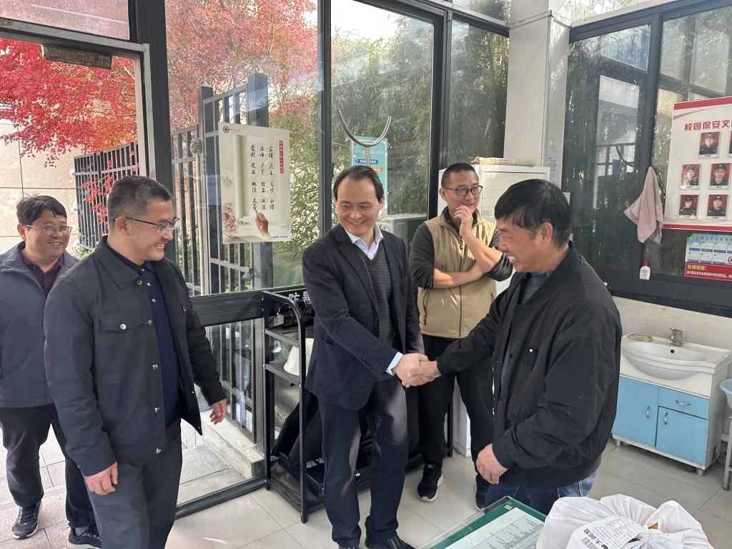 欢送仪式在蒋师傅曾星夜值守的岗位上进行。校领导们与蒋师傅并肩而立,回顾了他自入职以来近两千个日夜的坚守与付出。王运思书记和刘阳校长对蒋师傅六年多来的工作给予了高度认可和衷心感谢,称赞他是校园安全的“忠诚卫士”,以高度的责任心和友善的态度,为平安校园建设作出了扎实贡献。