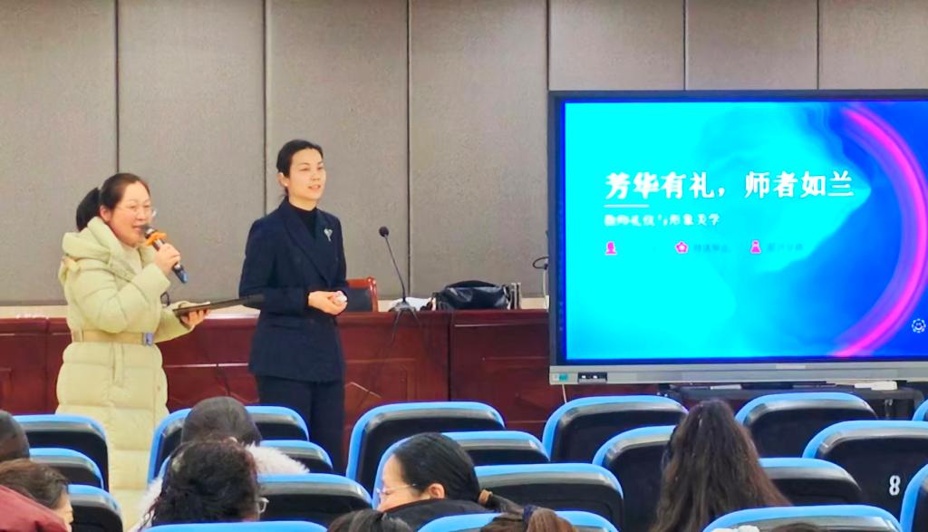 活动内容包括三个部分:职业礼仪,现场示范和会后交流。讲座中,韩雪老师结合多年高级礼仪培训经验,围绕女教职工常见的问题,系统讲解了教师职业形象、得体举止、服饰穿搭等重点内容,引导大家从发型、妆容、站姿、坐姿、走姿、手势、肤色、身材、服饰、穿搭技巧等方面提升教师职业礼仪素养。