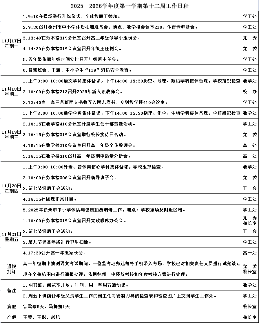 2025—2026学年度第一学期第十一周工作日程