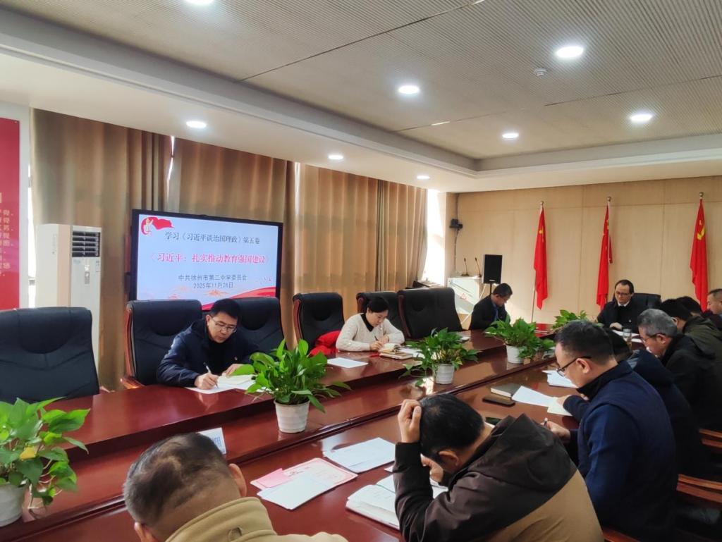 为深入学习贯彻《习近平谈治国理政》第五卷精神,深刻领会习近平总书记关于扎实推动教育强国建设的战略部署,切实把思想和行动统一到党中央决策要求上来,11月28日,徐州市第二中学党委理论学习中心组在319会议室召开专题学习会,先集中观看“先锋淮海党员大课堂”(第2期)视频培训班线长直播活动,然后围绕《习近平:扎实推动教育强国建设》展开集中学习研讨。学校党委领导班子成员、中层干部参加会议,党委委员、工会主席朱洪磊领学。