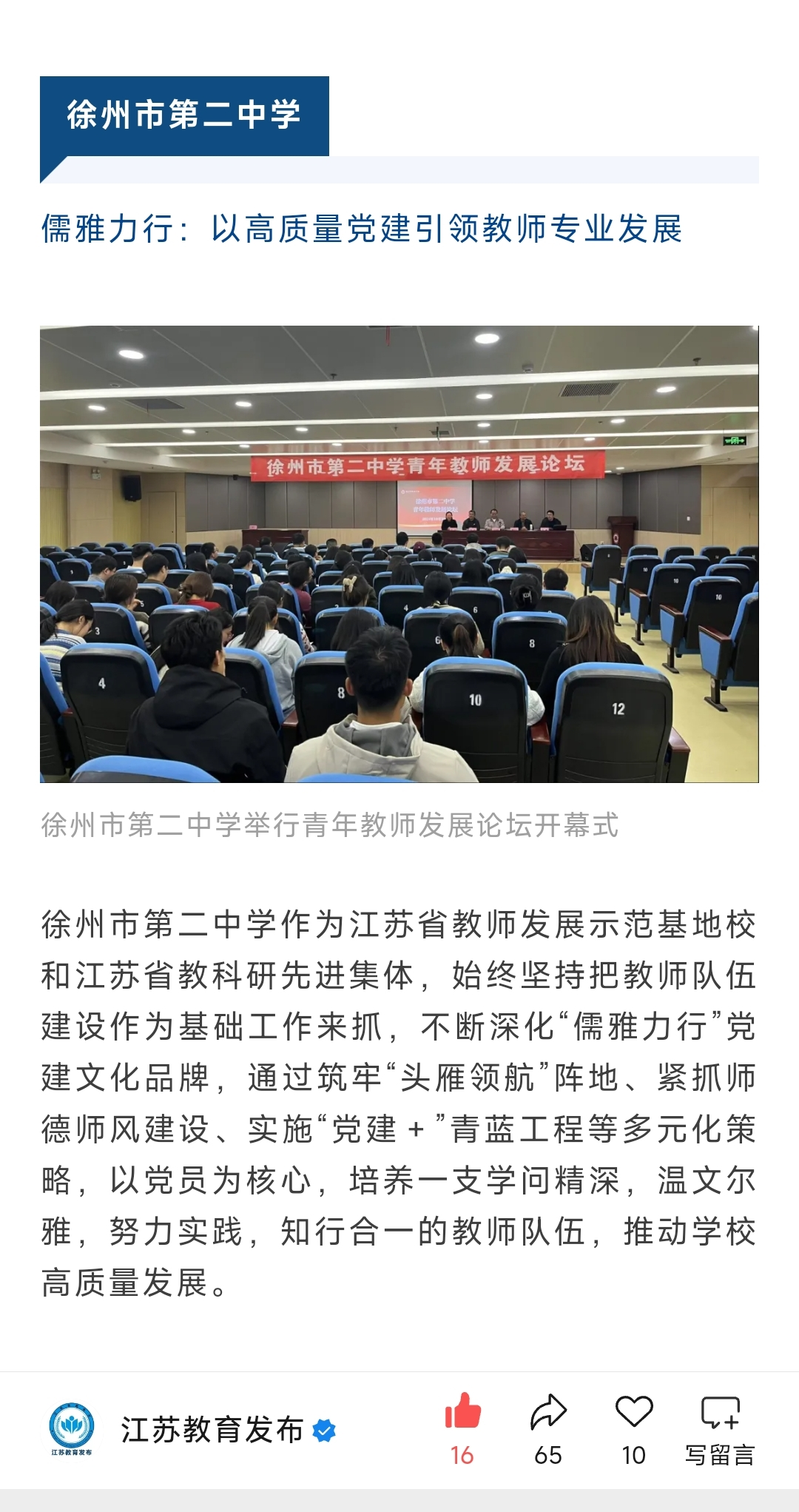 近日,江苏教育发布推出《中小学校“双带头人”党组织书记工作案例展示》系列报道,我校申报的《儒雅力行:以高质量党建引领教师专业发展》案例成功入选,成为全市展示的五个典型案例之一。这是对我校持续推进党建与教育教学深度融合、打造特色党建文化品牌的充分肯定。