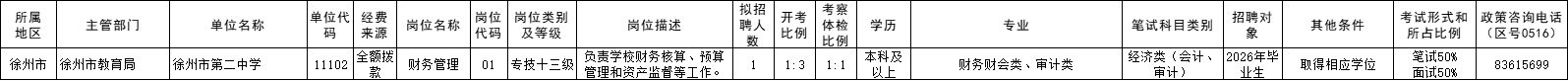 更多具体要求,参见徐州市教育局《徐州市2026年事业单位统一公开招聘人员公告》http://jyj.xz.gov.cn/govxxgk/jyj/2026-03-21/e8a9169c-5db6-4e08-8884-3642d93f0d64.html、徐州市人力资源和社会保障局《徐州市2026年事业单位统一公开招聘人员公告》http://hrss.xz.gov.cn/001/001004/20260320/9545437c-677a-4dac-bcc9-476e7e0773d1.html。