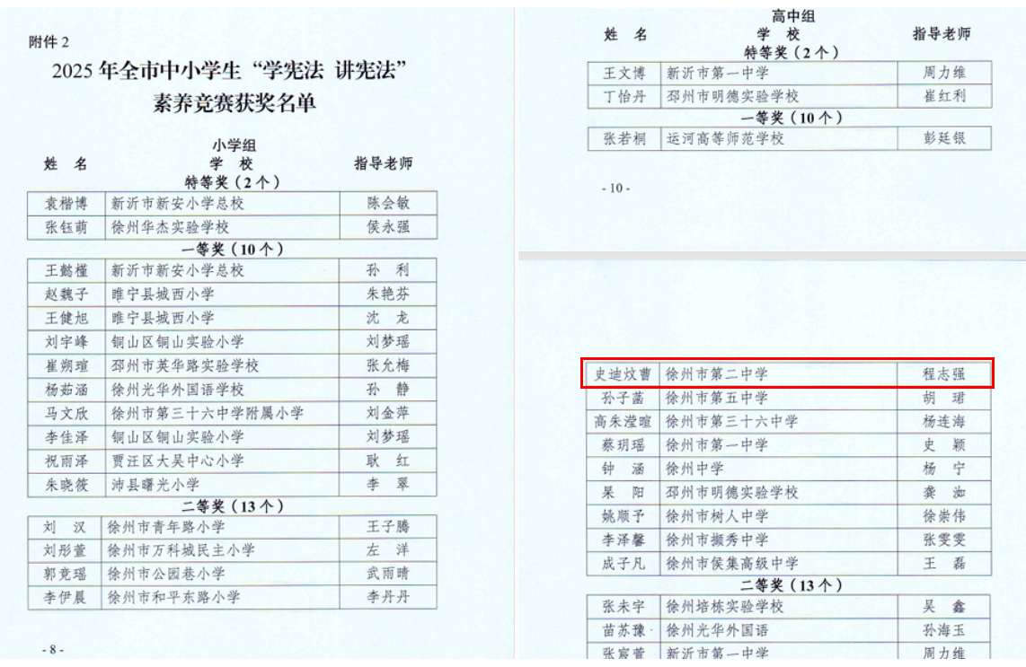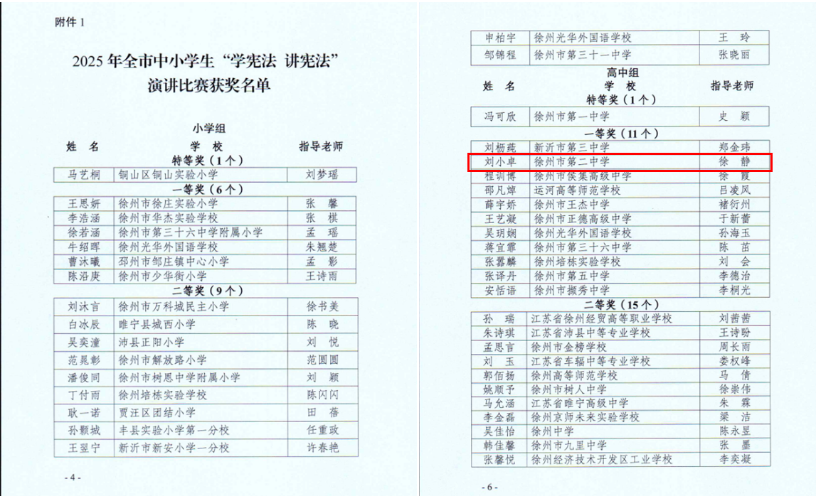近日,2025年徐州市中小学生“学宪法、讲宪法”比赛结果正式揭晓。我校选派参赛的两名优秀学子凭借出色表现,双双荣获一等奖,为学校赢得了荣誉。其中,刘小卓同学在演讲比赛中折桂,史迪炆曹同学在素养竞赛中夺魁,充分展示了我校在青少年法治教育和综合素质培养方面的丰硕成果。