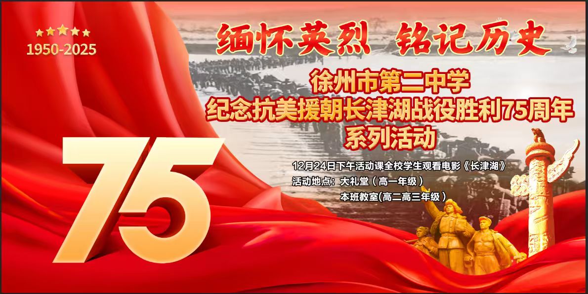 为铭记革命先烈壮举,传承伟大抗美援朝精神,2025年12月24日,徐州市第二中学以“冰雪铸忠魂 青春承使命”为主题,开展纪念抗美援朝长津湖战役胜利75周年系列活动,通过校会宣讲、观影致敬等形式,让红色基因浸润校园,让英雄精神照亮青春征程。