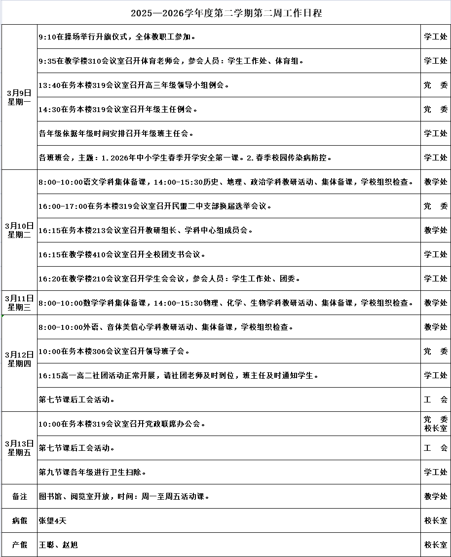 2025—2026学年度第二学期第二周工作日程