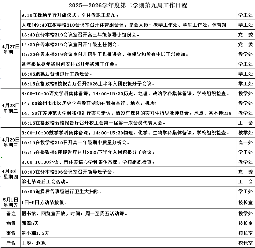 2025—2026学年度第二学期第九周工作日程