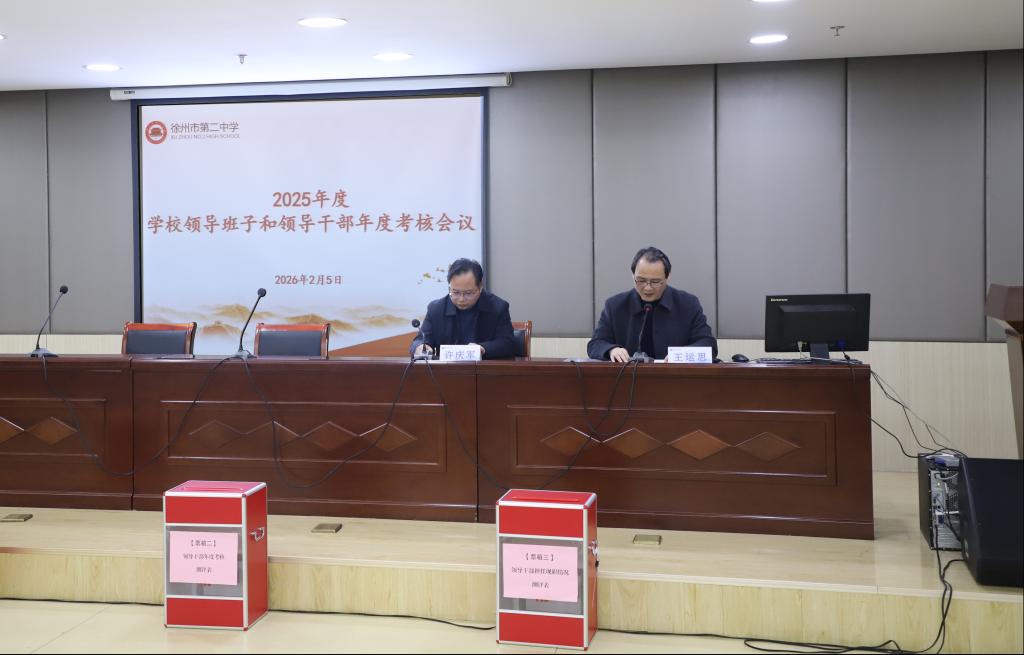 2026年2月5日,徐州市第二中学召开2025年度领导班子和领导干部年度考核会议。市教育局职业教育与社会教育处处长许庆军同志到会指导。学校中层以上干部、民主党派负责人、高级职称教师及群众代表参加会议。会议由学校党委书记王运思同志主持。