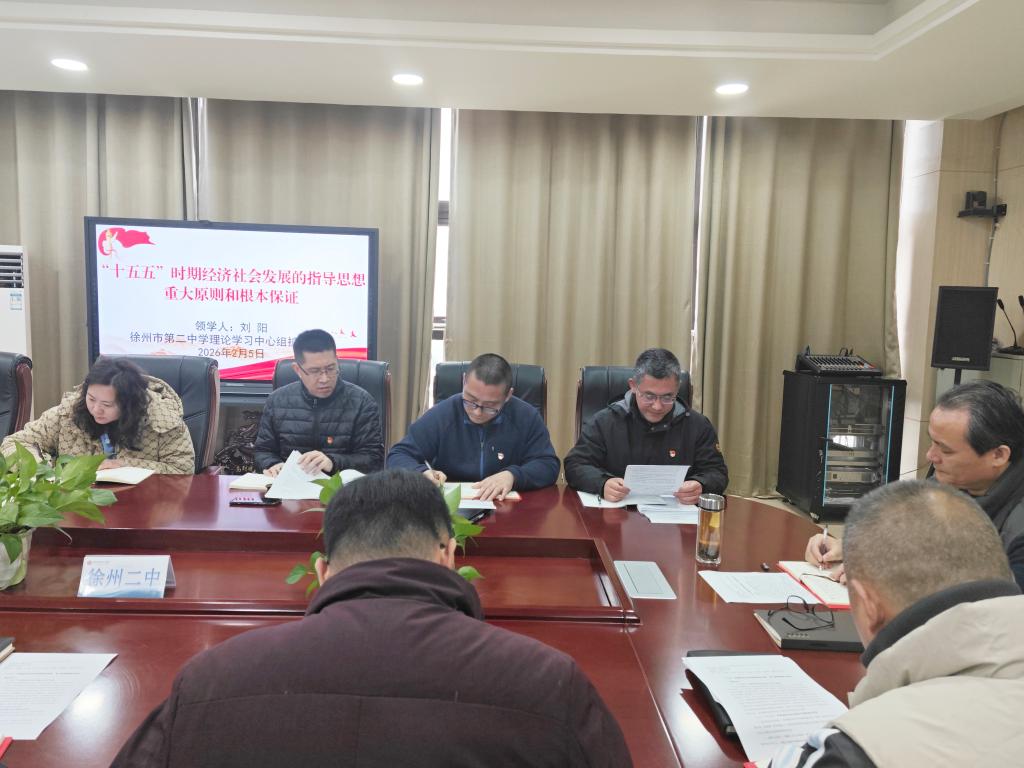 2026年2月5日,徐州市第二中学党委理论学习中心组在319会议室召开专题学习会,深入学习“十五五”时期经济社会发展的指导思想、重大原则和根本保证。党委副书记、校长刘阳主持并领学,学校领导班子成员及全体中层干部参加本次学习。