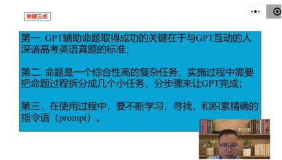 唐老师详细介绍了自己的教科研成果,对GPT如何助力课堂教学进行了模拟展示,唐老师还论述了在高考英语复习中如何使用GPT辅助,以及如何使用GPT开展高质量的命题活动。
