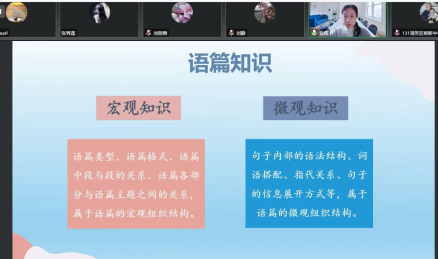 袁教授开设题为《阅读教学中语篇知识与深度学习的探究》的讲座。首先,袁教授从宏观和微观的角度对目前研究的一个热点即义务教育新课标的语篇知识进行了解说。其次,她示范朗读了4个语篇材料,并依据义务课标中二级和三级语篇标准,详细解读了教师如何将语篇知识渗透在阅读教学中,助力深度学习。最后,袁教授还分享了她们教科研团队近期的一个研究成果——《在阅读教学中语篇知识实现深度学习的探究》。该研究以牛津译林版高中英语教材必修一第二单元语篇为例,训练学生通过“联想已有经验,建构结构化知识;深度加工语篇,发展高阶思维;批判语篇内容,表达独立思想;迁移所学知识,形成创新成果;反思学习过程,评价学习成效”等路径,最终达成深度学习的目的,促进英语学科核心素养的形成。