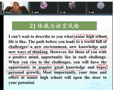 语篇是英语教学的基础资源,深入研读语篇,把握主题意义,以挖掘文化价值,分析文体特征和语言特征及其与主题意义的关联,对教师做好教学设计具有重要意义,是教师落实英语学科核心素养目标以及创设合理学习活动的重要前提。穆凤英和袁辉两位教授的讲座观点鲜明、内涵丰富、风趣生动,既有理论的深刻感悟,也有多年实践的升华提炼,具有很强的理论性、针对性、示范性,让我们受益匪浅。作为一名当代教师,特别是处在多元价值观的时代。我们更需要有一颗积极向上向善的进取心,潜心教育,真心育人,积极实践以语篇为中心的教学方式,在全面分析语篇内容、特点和价值观后,能够使用多模态的语篇类型,设计多样的教学活动,引导学生深刻理解语篇,侧重培养学生的语言运用能力及语言文化素养。同时还要多引导学生广泛阅读符合他们水平的多模态语篇,使学生学会欣赏多模态语篇的意义和美感,并培养他们阅读的良好习惯,丰富生活经历,拓展思维,提高审美、鉴赏和评价的能力。